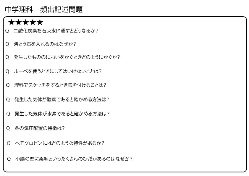 中学三年理科 中学3年生で習う単元をまとめています。テスト前の確認などに是非ご利用ください! 塩化銅水溶液と塩酸の電気分解 酸性とアルカリ性の実験 酸性・中性・アルカリ性のPH 理科ポスターイオン編 イオン化傾向実験 ボルタ電池とダニエル電池 化学反応式・電離の式・中和 力の合成と分解 細胞分裂の図 いろいろな生物の染色体の数 メンデル遺伝ゲーム 生物ポスター① 生物ポスター② 生物の進化 生物の進化② 顕性と潜性の例 頻出化学反応式 南中高度 生産者消費者分解者 プラスチックの性質 中和イオン数の増減 月の見え方 動滑車・定滑車クラフト いろいろな月の呼び方 太陽 熱の伝わり方 日食と月食 天体 季節と方角と時間帯 地球の位置と星座 星の見える時間の問題 天体いろいろまとめ 指示薬まとめ 頻出記述問題 記録タイマー 理科今と昔の違い 一次電池と二次電池 等速直線運動と等加速度運動 いろいろな運動 高校入試で出てくる化学反応式 物体の運動ポスター 速さ練習問題 天体ポスター① 慣性の法則 太陽系の惑星 水質調査(指標生物) 電気エネルギーのつくり方 再生可能エネルギー① 日本の国立公園 いろいろな単位 いろいろな単位② 下水処理場ではたらく微生物 静岡県高校入試理科大問1 高校入試理科計算問題いろいろ 高校入試向け頻出記述問題 その他の学習のプリントはこちら