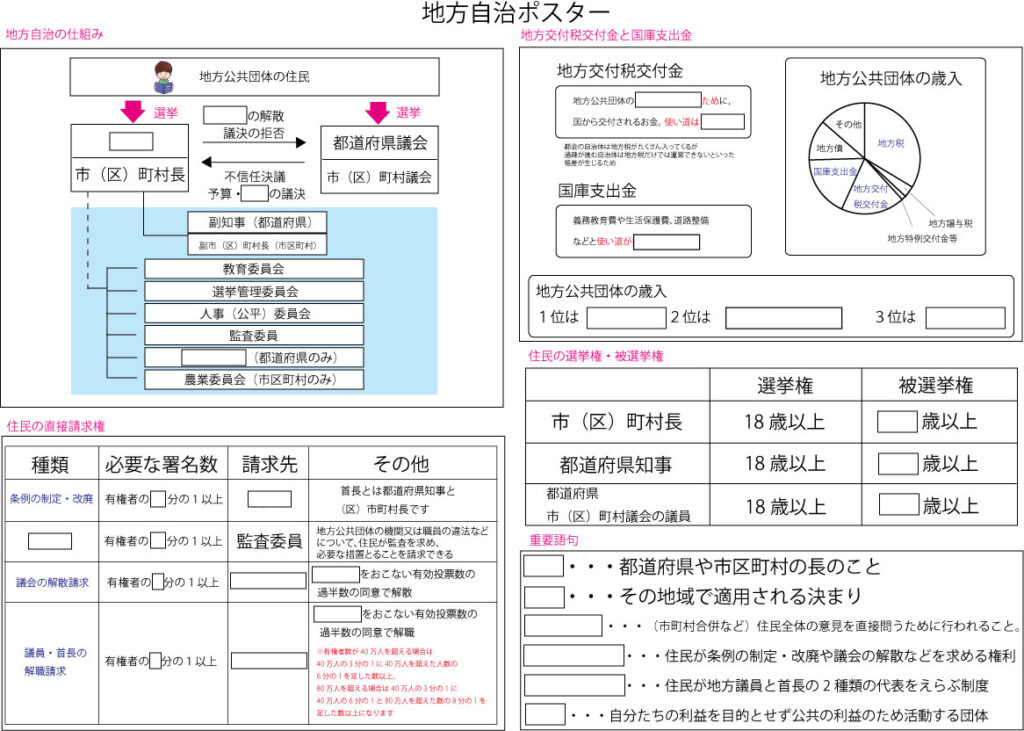 中学社会公民 中学社会公民プリント 公民 主な年中行事 頻出資料問題② 全国のお雑煮 旧民法と新民法 ロック・ルソー・モンテスキュー 物事を決定する方法 現代社会の特色と生活 日本国憲法頻出条文 大日本帝国憲法と日本国憲法の違い 人権ポスター 基本的人権プリント 憲法改正と国事行為 国会の仕組み① 国会の仕組み② 内閣の仕組み 三権分立 内閣の組織図 国会・内閣・裁判所まとめ 裁判の仕組みとはたらき① 裁判の仕組みと働き② 株式会社のしくみ 3つの経済主体 均衡価格 公民頻出記述TOP⑩ おもな税金 住民の直接請求権 円高・円安の影響 地方自治ポスター 累進課税制度 ドント式計算方法 いろいろな選挙 地方交付税交付金と国庫支出金 日本の社会保障制度 好景気と不景気 公民資料読みとり問題 現代社会の特色と生活 日本の主な年中行事 頻出資料② 旧民法と新民法 ロック・ルソー・モンテスキュー 現代社会の特色と生活練習問題 日本国憲法頻出条文 日本国憲法頻出条文練習問題 大日本帝国憲法と日本国憲法のちがい 基本的人権プリント(自由権、社会権、平等権、参政権他) 基本的人権練習問題 憲法改正と天皇の国事行為プリントはこちら 憲法改正と天皇の国事行為練習問題はこちら 国会のしくみ①② 内閣の仕組み 三権分立 裁判の仕組みとはたらき① 裁判の仕組みとはたらき② 3つの経済主体 株式会社のしくみ均衡価格 おもな税金 累進課税制度 住民の直接請求権 円高・円安 地方交付税交付金と国庫支出金 日本の社会保障制度 好景気と不景気 頻出記述TOP⑩ ドント式計算方法その他の学習プリントはこちらTOPページに戻るのはこちら