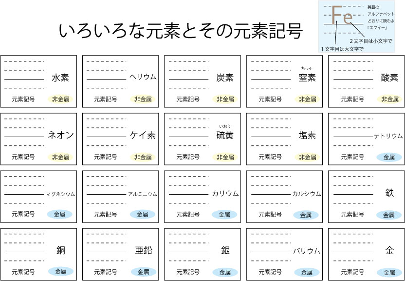 いろいろな元素とその元素記号 2025年4月18日2025年4月19日 / by 投稿者 管理人 いろいろな元素とその元素記号の練習用プリントです。 中学2年生の教科書に出てくるものを中心にまとめてみました。練習用プリントと共にお使いください。 元素記号ポスターはこちら 練習用プリントはこちら その他の学習プリントはこちら TOPページに戻るはこちら Related posts:歴史文化視力検査ギリシャ文字視力検査勉強ガチャ中3編フランシスコ・ベーコンの「4 つのイドラ」頭の体操(脳トレ問題)経済ポスター歴史文化パズルゲーム中学歴史にでてくる中国の指導者中学歴史に出てくるアメリカの大統領天体ポスター