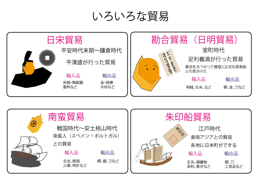 それぞれの貿易の時代、特徴、主な輸入品・輸出品をおさえておきましょう。