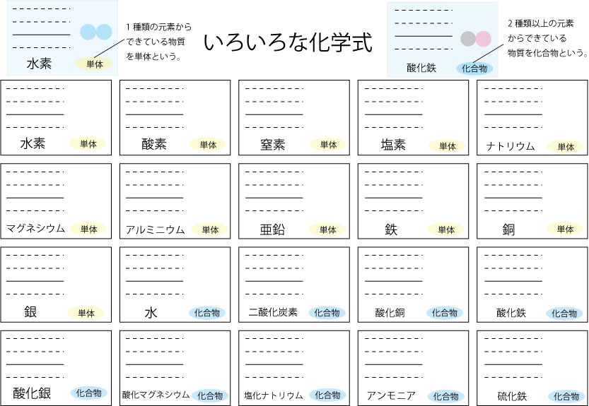 化合物・・・2種類以上の元素から できている物質 を化合物という。