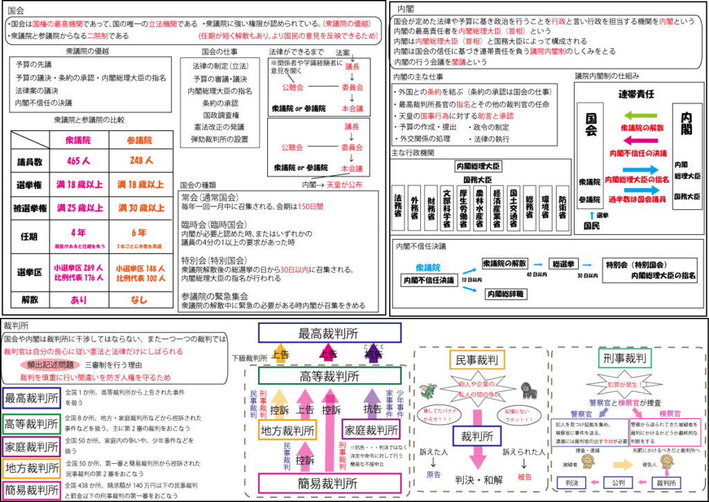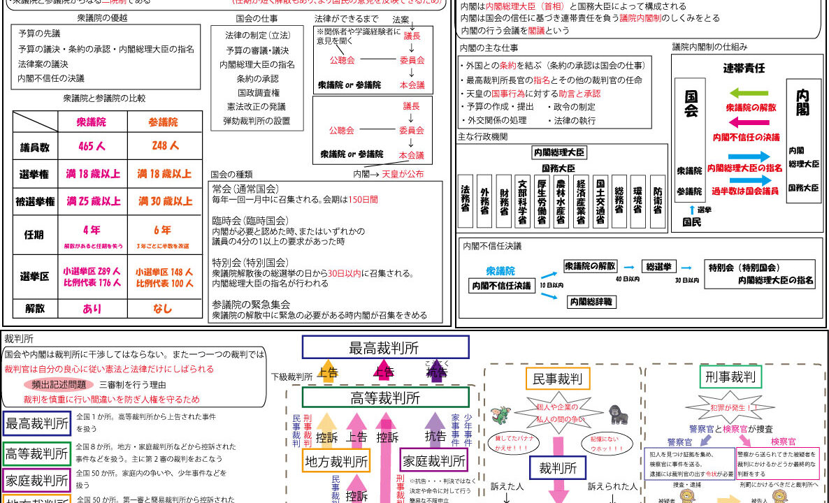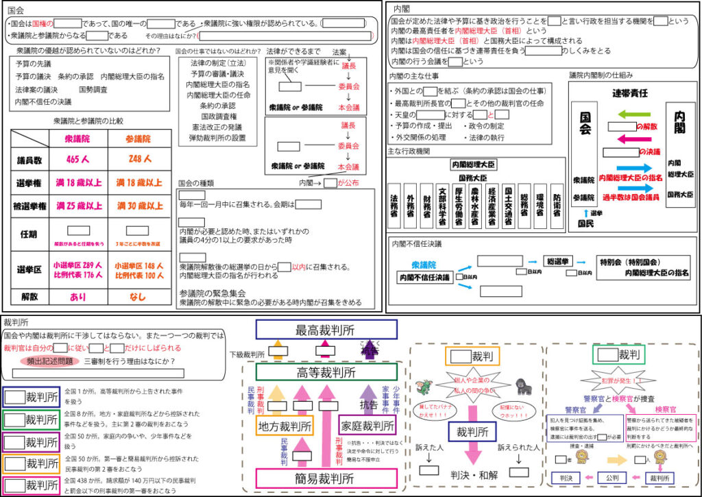 国会・内閣・裁判所まとめプリントです。A3でのプリントアウトがおすすめです。