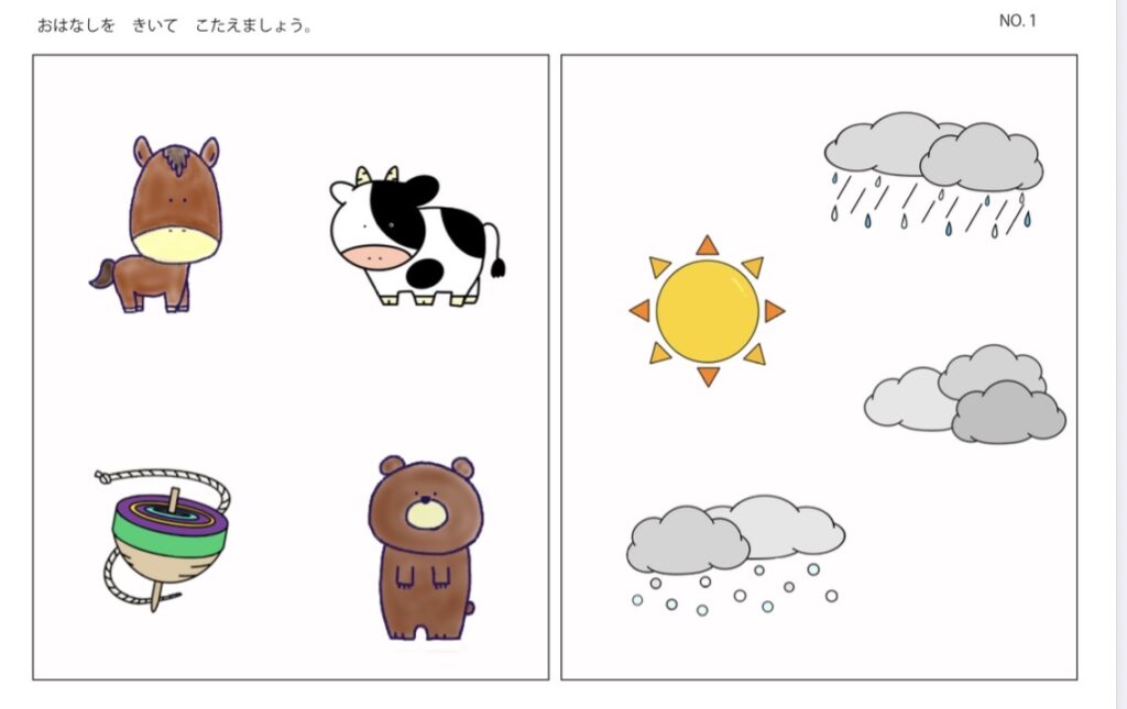 お話を聞いて問題に答えてみよう! 2026年3月10日2026年3月10日 / by 投稿者 管理人 NO.1 ある晴れた日に、馬が散歩をしています。 Q:散歩(さんぽ)をしていたのは、何(なん)でしょう。 Q:どんな天気(てんき)ですか。 練習問題① Related posts:社会歴史単語帳⑨動画用素材社会歴史単語帳⑧社会歴史単語帳⑦英検3級二次試験練習プリント英検2級二次試験練習問題社会歴史単語帳⑥社会歴史単語帳⑤歴史 条約一覧平面図形と空間図形