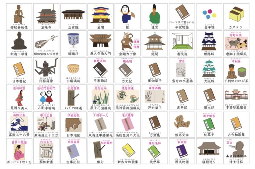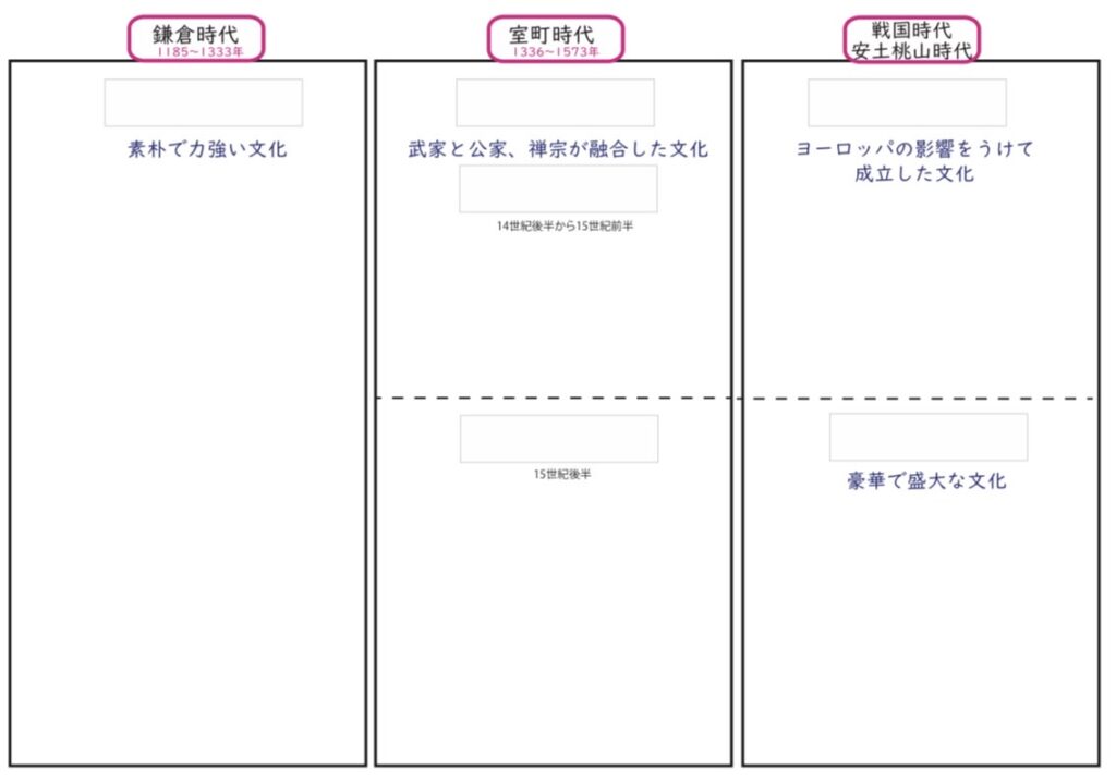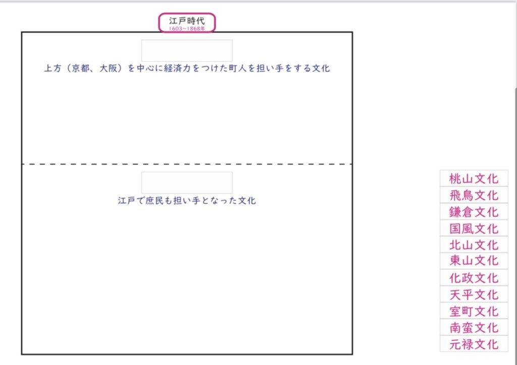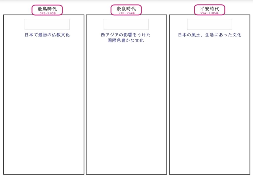 (飛鳥文化、奈良文化、平安文化、鎌倉文化、室町文化 北山文化、東山文化、 南蛮文化、桃山文化、元禄文化、化政文化)