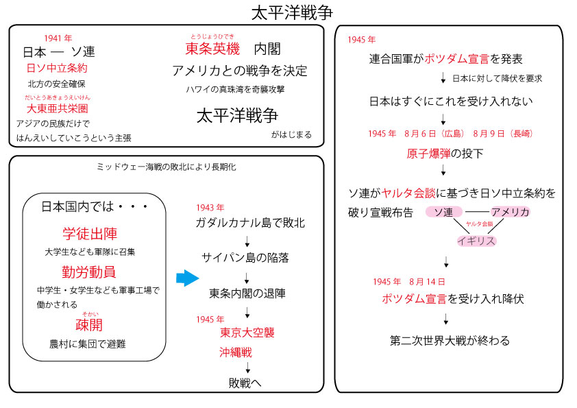 太平洋戦争 2025年6月14日2025年6月14日 / by 投稿者 管理人 太平洋戦争についてまとめてみました。 第二次世界大戦プリントと合わせて終戦までの流れをしっかり覚えましょう!! 太平洋戦争プリントはこちら 練習問題はこちら その他の学習プリントはこちら TOPページに戻るはこちら Related posts:歴史文化視力検査ギリシャ文字視力検査勉強ガチャ中3編フランシスコ・ベーコンの「4 つのイドラ」頭の体操(脳トレ問題)経済ポスター歴史文化パズルゲーム中学歴史にでてくる中国の指導者中学歴史に出てくるアメリカの大統領天体ポスター