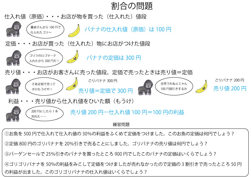 利益・・・売り値から仕入れ値をひいた額(もうけ)