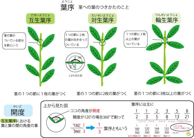 互生葉序における葉と葉の角度のことを開度といい、開度を360°でわり分数で表したものを~葉序とあらわすこともあります。