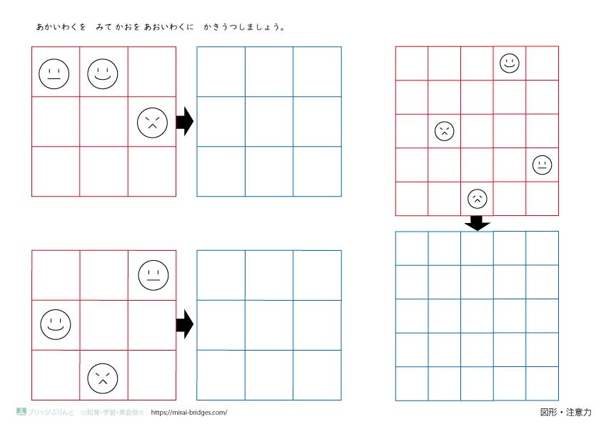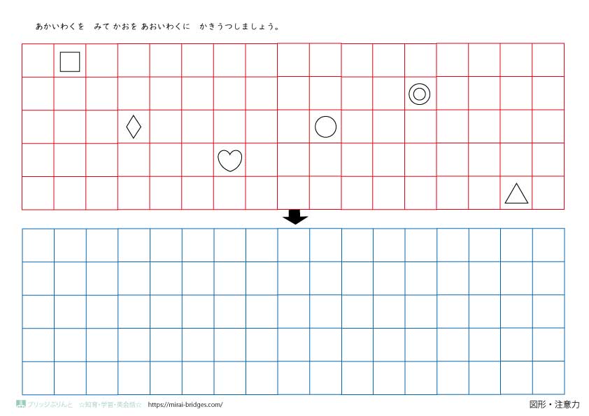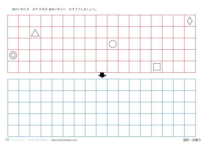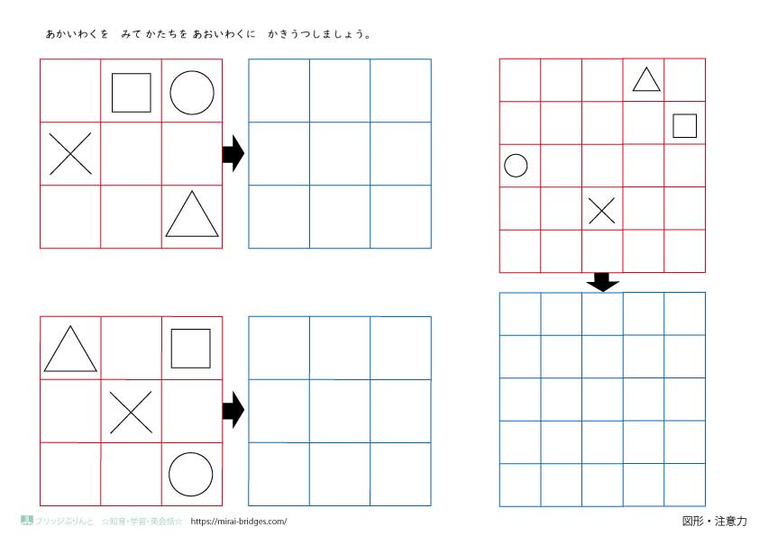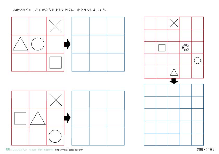 図形・注意力の分野では見る力を育みます。同時に空間認知力・位置記憶力もつきます。